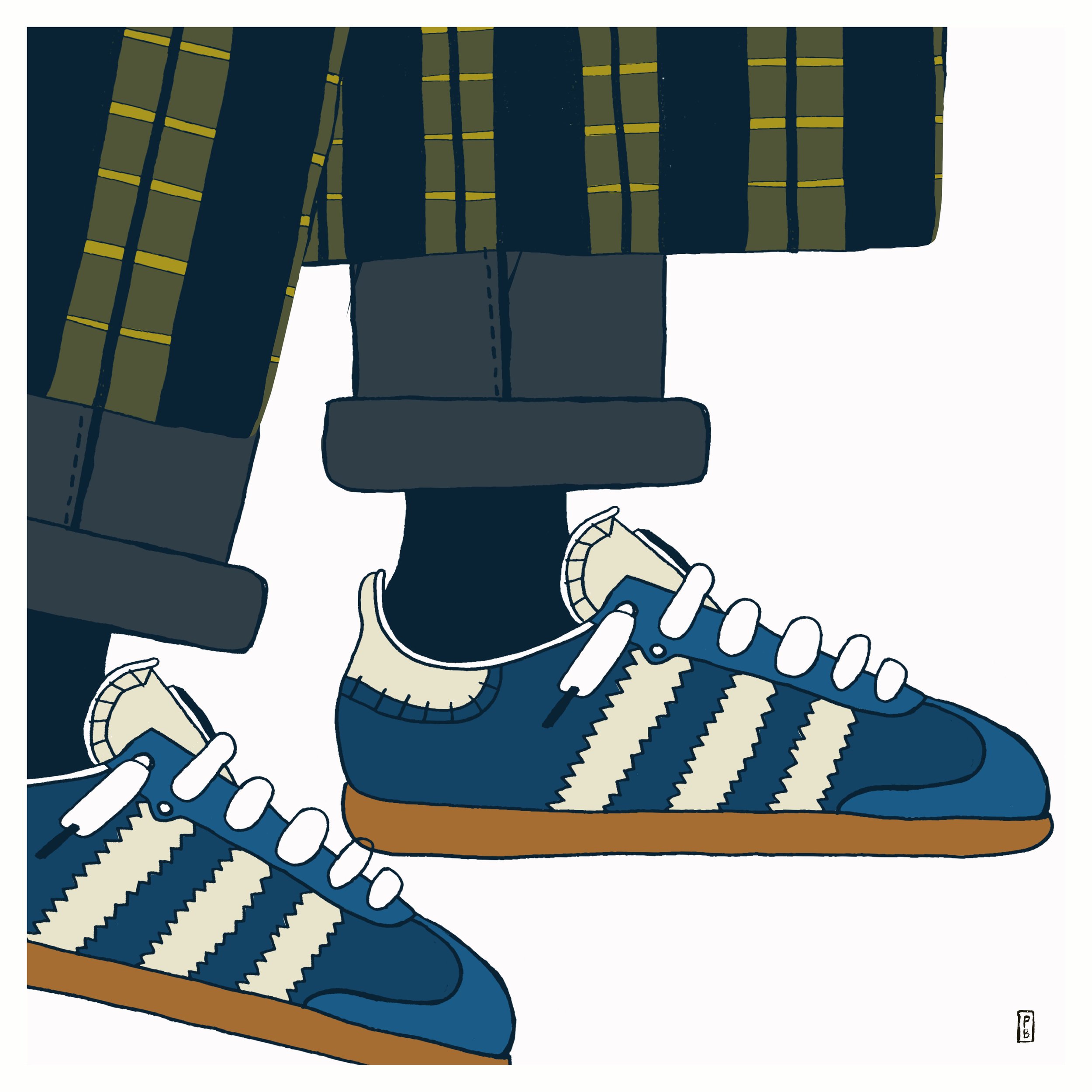 I love sketching a classic sneaker like the Adidas Gazelle, especially when I see someone on the street styling them in an unexpected way. In this case, a plaid overcoat and rolled up jeans.